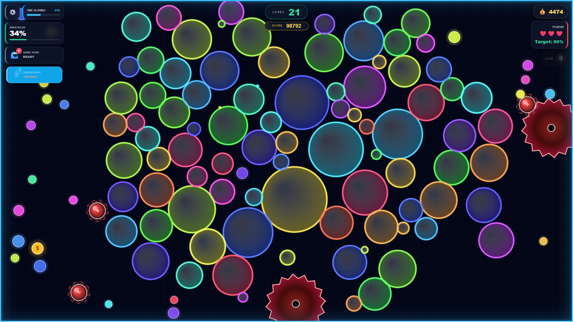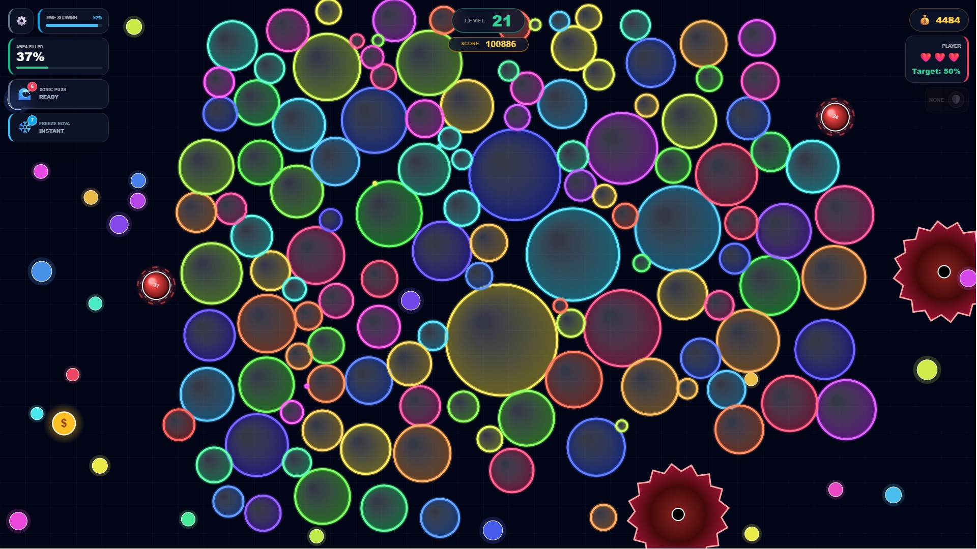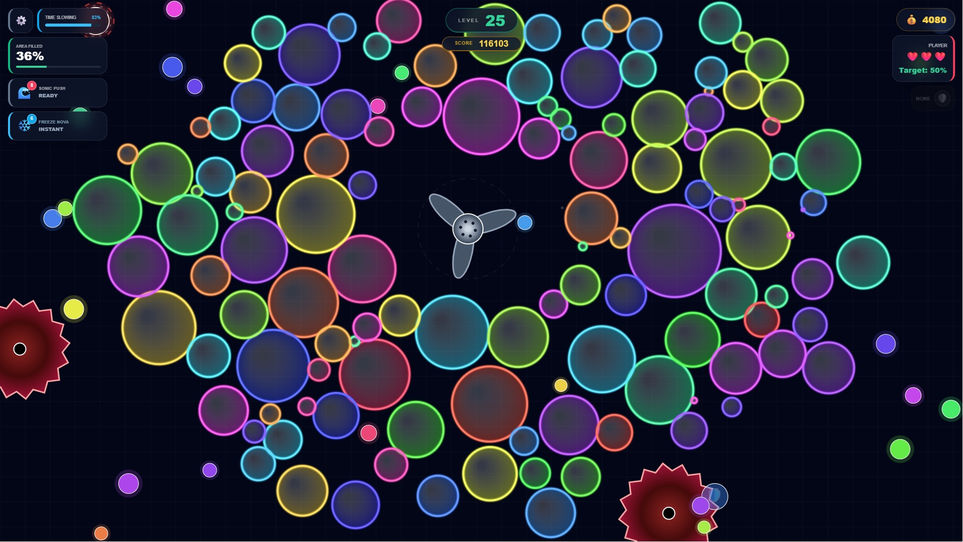 - Power-Ups & Abilities: Collect shields, bombs, and extra lives. Use Time Slow, Freeze Nova, and Sonic Push to get out of tight spots!
